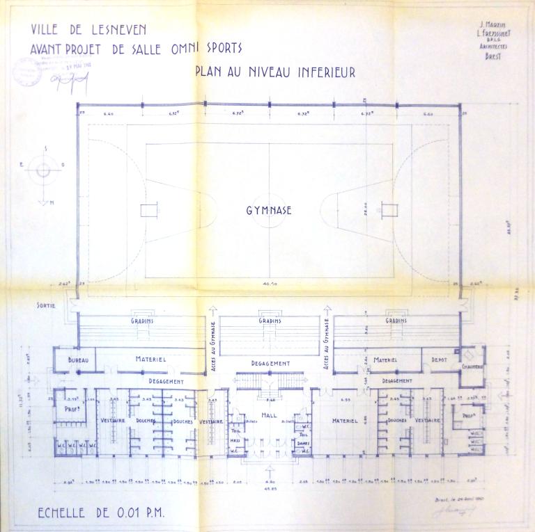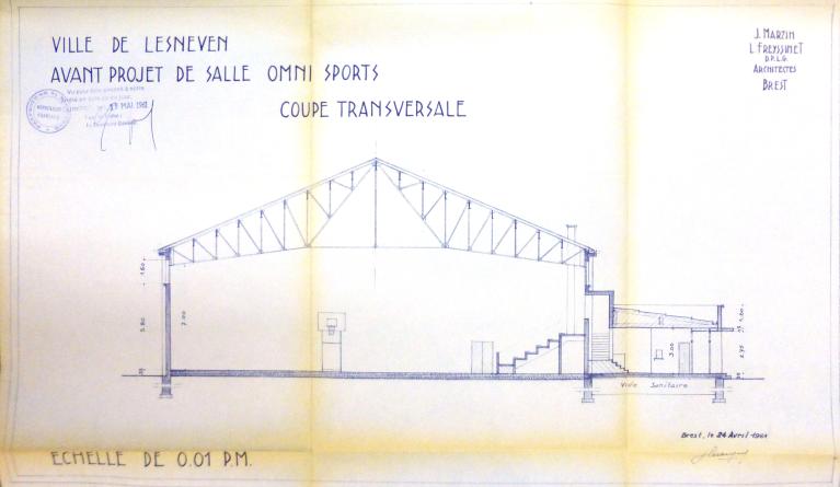 Le 12 août 1960, le conseil municipal approuve le projet de construction d’une salle omnisports établi par les architectes brestois J. Marzin & L. Freyssinet et sollicite une subvention pour la réalisation des travaux, estimés à 323 801,20 F. Le projet fait l'objet d'un arrêté d'approbation technique le 17 mai 1961 et d'une promesse de subvention de 142 866 F au taux de 40% le 19 décembre 1963. Adjugés le 9 juin 1964, les travaux sont en voie d'achèvement en mars 1966. Une salle destinée au tennis de table est ajoutée à l'arrière en 1971.