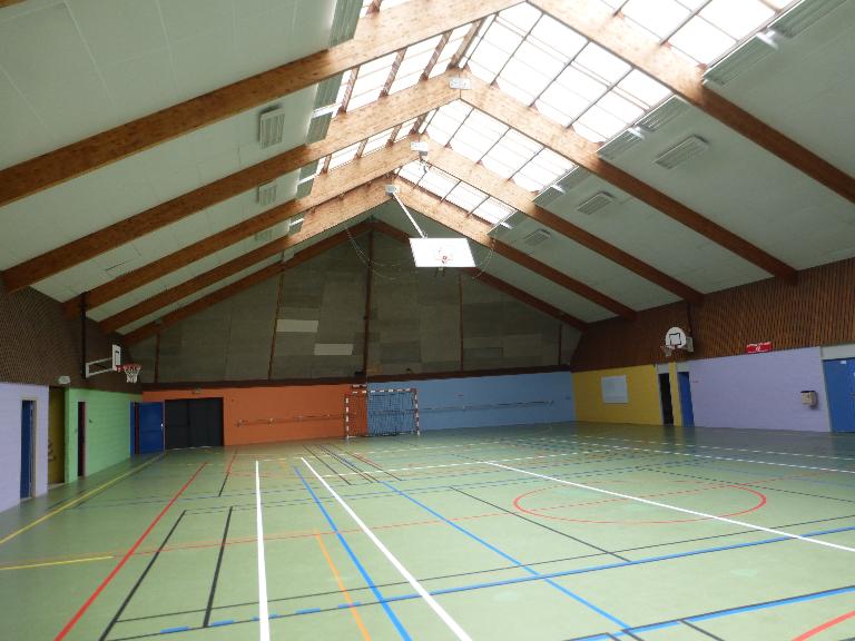 Halle de sports composée d’une aire de jeux de 40 m x 20 m avec locaux annexes, vestiaires, sanitaires et local technique. Structure extérieure en agglomérés cimentés destinés à recevoir une peinture. Charpente lamellé avec revêtement toiture en bardeaux d’asphalte.