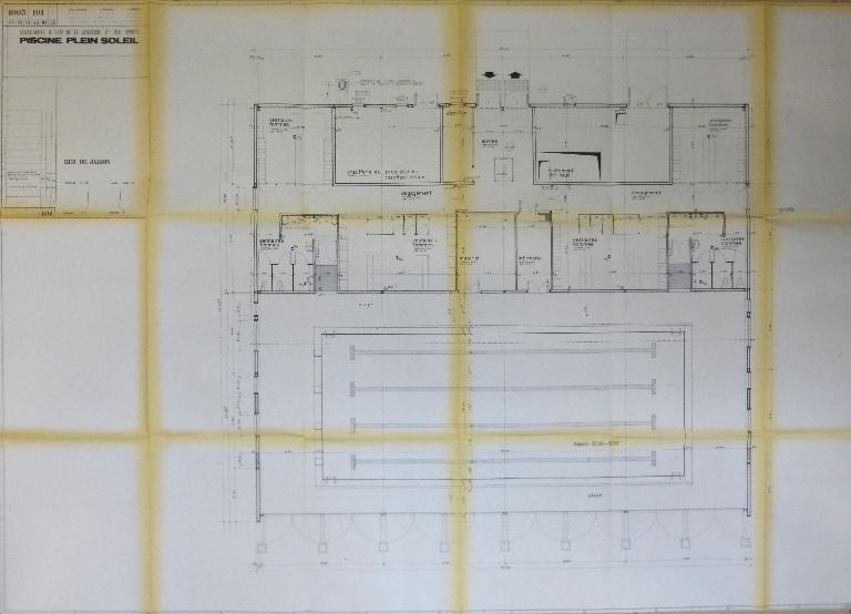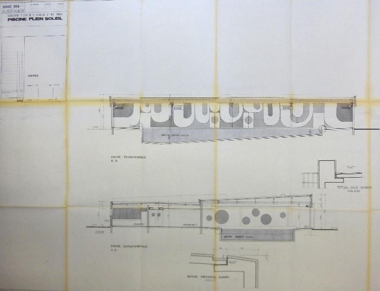 Piscine industrialisée de type « Plein Soleil » comprenant un bassin de 25 m x 10 m avec vestiaires-sanitaires infirmerie, chaufferie desservis par un hall d’entrée et des dégagements. La construction se compose d’une ossature métallique du type portique en profils pleins sur trois appuis articulés. La couverture roulant sur les portiques se compose de cinq sommiers et de six cours de pannes munis de potelets à hauteur variable. Contreventement assuré par une poutre en I sur la façade côté solarium et par des palées cadres.