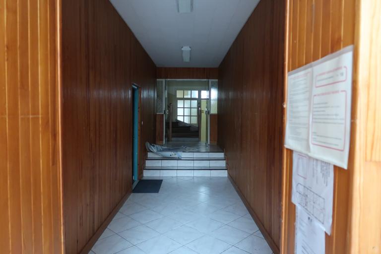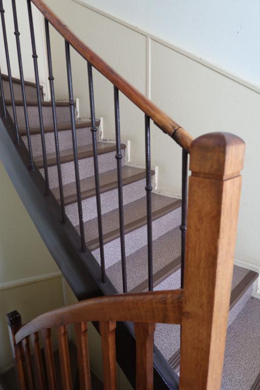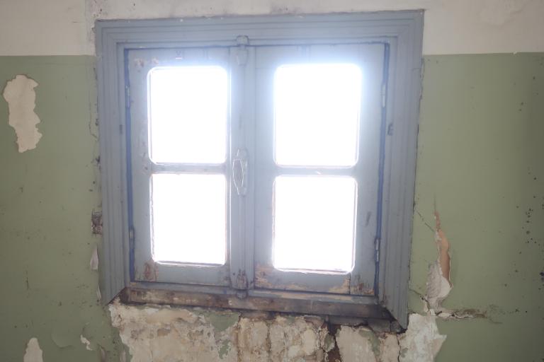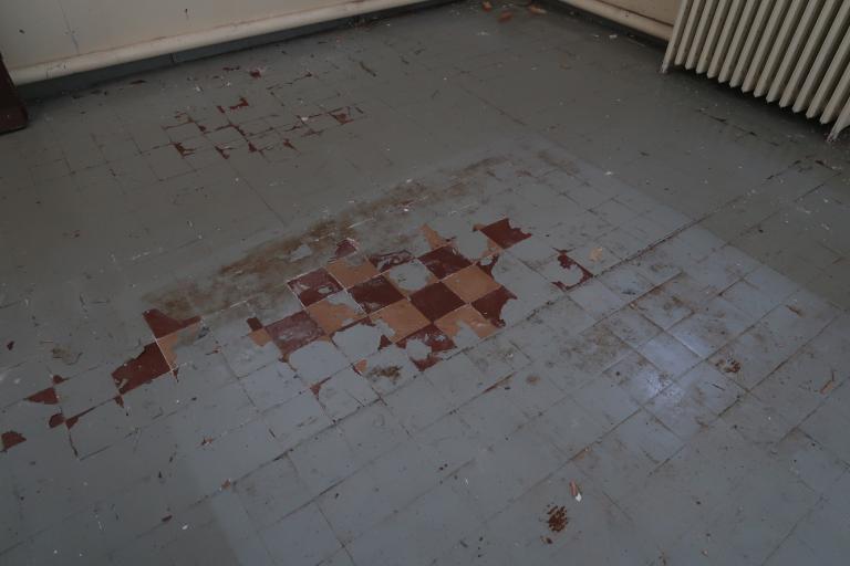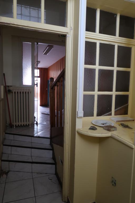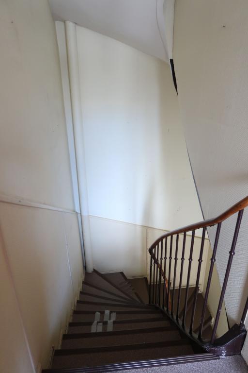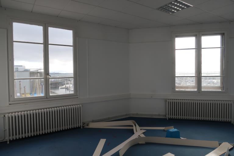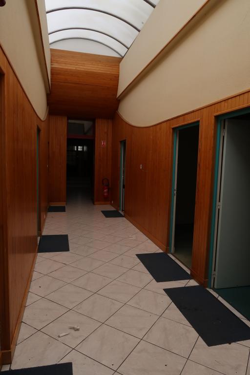A l'intérieur, à chaque niveau, un couloir (central au 1er niveau ; situé côté nord, aux 2sd et 3e niveau) desservent des bureaux (superficie variée ; sol moquette sur plancher) ; plusieurs points d'eau pour cuisines et toilettes. Un escalier central (rampe bois et métal) dessert chacun des niveaux. Le dernier niveau (espace stockage archives-étagères bois) donne sur le toit-terrasse du bâtiment.