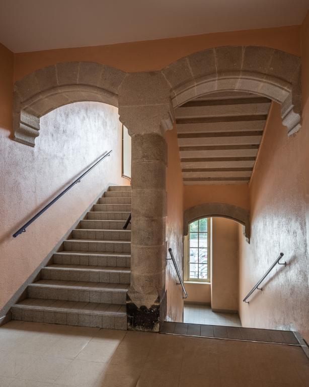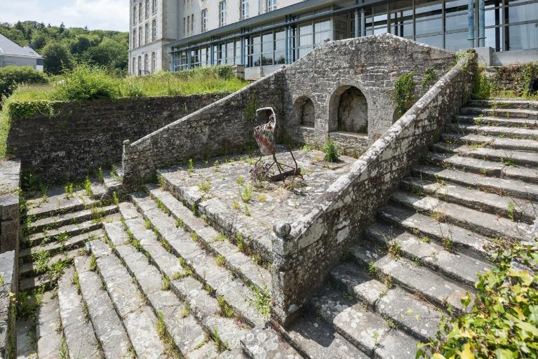 Au devant de la façade sud-est du quadrilatère des bâtiments, un escalier monumental en U associé à deux niveaux de terrasses maçonnées appartient également à la construction du premier couvent. Il présente une disposition remarquable : sa partie centrale contient un large escalier menant à une plateforme qui précède trois arcades soutenant le perron d'arrivée. En contrebas, sous la terrasse de gauche, une large arcade surbaissée devait probablement ouvrir sur une fontaine alimentée par le ruisseau qui descendait des hauteurs de Kerlan et remplissait également les étangs du couvent visibles sur le cadastre de 1834 et faisait tourner le moulin.