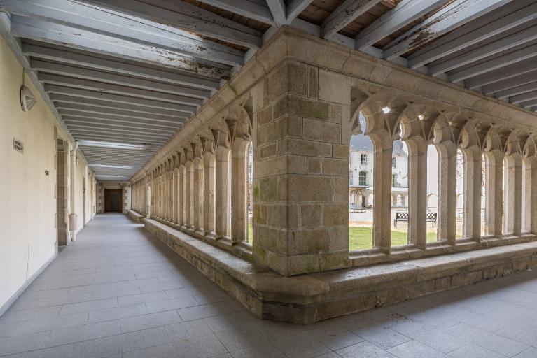 Celle-ci est bordée d'un cloitre, dont la majeure partie, de style gothique, provient du couvent des Carmes de Pont-L'Abbé et date du 15e siècle. Ce cloitre a été remonté ici en 1902.