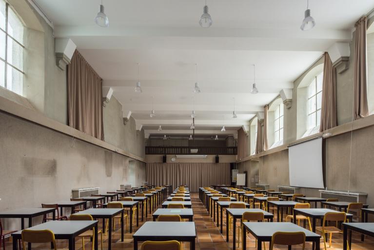La chapelle a également été réaménagée. Le rez-de-chaussée sert de salle de réunion, un étage a été créé pour abriter une salle de devoirs. La charpente a été reprise, tout en conservant les fermes sculptées d'origine, qui laissent apparaître plusieurs traces de polychromie.