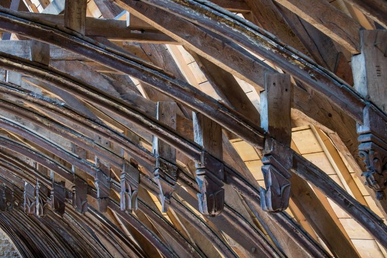 Lors de la reconstruction des ailes sud-ouest, sud-est et nord-est, au 19e s, par les architectes diocésains Joseph Bigot puis Henri Rapine, a été conservée la chapelle de l'ancien couvent des filles du Calvaire, qui date de 1663 et possède un enfeu protégé au titre des monuments historiques ainsi qu'une charpente sculptée remarquable. Celle-ci est composée d'une suite de chevrons fermes auxquels des cerces moulurées et rainurées destinées à recevoir un lambris sont suspendues par des clefs pendantes accrochées à la charpente par un assemblage à enfourchement.