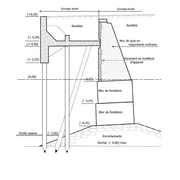 Quai Nord 309 m : quai poids en maçonnerie rempiété par un ouvrage en béton armé (dalle et poutres) ; rempiétement fondé sur pieux octogonaux en béton armé ; échelles ; bollard ; magasin D 6000m²
