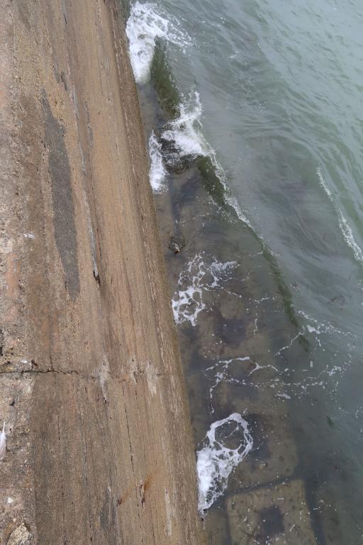 Enrochement artificiel en béton (côté sud) ; blocs placés en risberme côté nord.