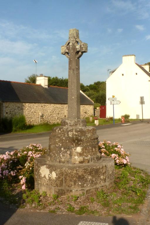 Cette croix monumentale, dite aussi croix de Rosco, porte sur son socle la date de 1885 et n’apparait pas sur le cadastre de 1837. Reconstruit en novembre 1979 par le sculpteur Stanis Godec de Pont-Croix, le croisillon était jusque-là en bois et portait, côté avers, un grand crucifix. (Aucune information sur la localisation actuelle de ce croisillon n’a été obtenue.)
