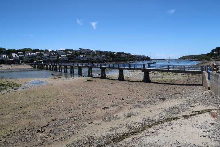 La passerelle située en fond de ria permet de rejoindre à pied et à vélo la presqu'île de Kermorvan et le quartier d'habitations qui s'y trouvent sans être dépendant des horaires de marées.