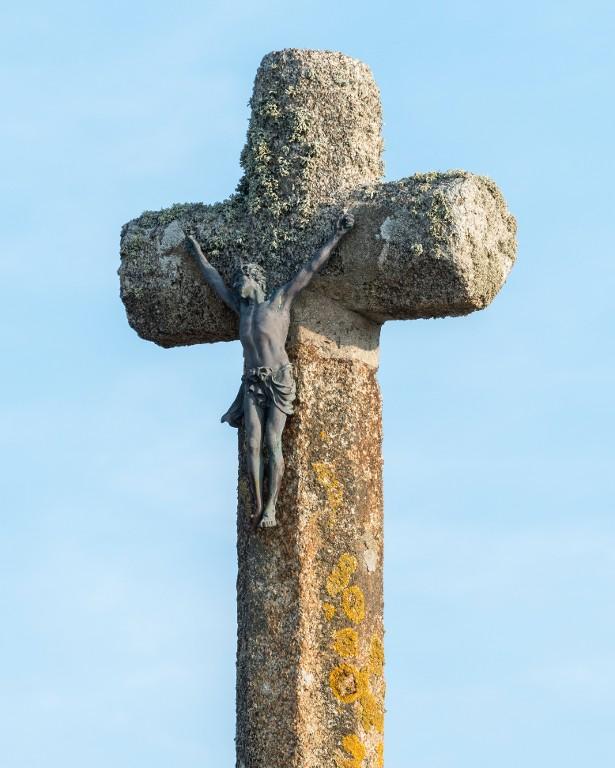 La Croix n°1 : Croix en granite, monolithe à chanfreins, fût en granite, Christ en métal, socle cubique, 4 degrés.