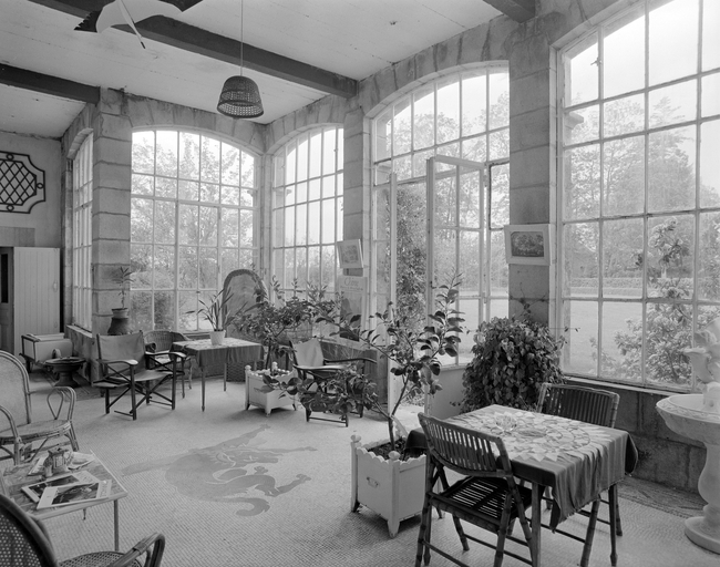 Important pavillon rectangulaire construit à l'extrémité sud du corps de bâtiment ; double en profondeur ; avec tourelle de plan carré en saillie sur l'arrière faisant jonction avec le jardin d'hiver (mosaïque de style romain, marbre). Sous-sol sous l'ancien manoir ; jardin d'hiver en rez-de-chaussée.
