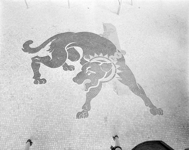 Sujet : chien aboyant inspiré des mosaïques romaines.