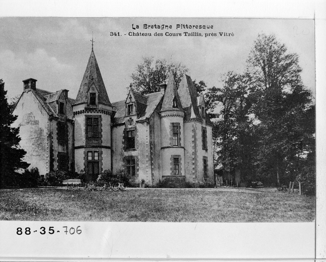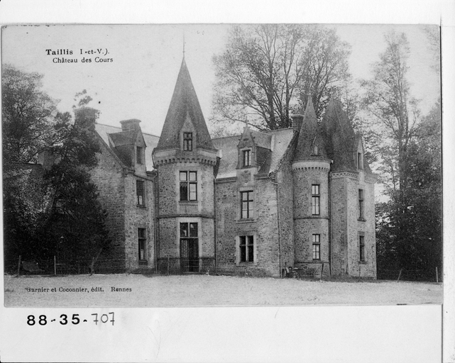 Sur le site ancien du manoir des Cours, le bâtiment du 16e siècle est entièrement remanié dans la 2e moitié du 19e siècle par Jacques Mellet (daté de 1870 par travaux historiques). L'édifice est alors castellisé (ajout de tours et de pavillons) et réorienté vers le nord du côté du parc à l'anglaise : les façades de l'ancien manoir ont été inversées, la façade postérieure est devenue la façade principale d'un nouveau logis enrichi de lucarnes, tourelles et pavillons. Une ancienne grange dîmière (limite 16e siècle 17e siècle), sur passage, est conservée à l'entrée de la cour réservée à la ferme.