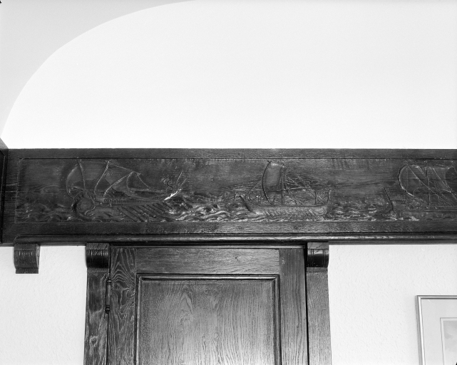 Précision représentationsSujet : ananas, support : épi de faîtage en céramique ; sujet : décor géométrique de mosaïque, support : tapis du couloir d'entrée et murs de la salle de bains ; sujet : poutres de bois sculptées représentant l'histoire de la marine, support : poutres de bois de la salle de séjour et du salon.