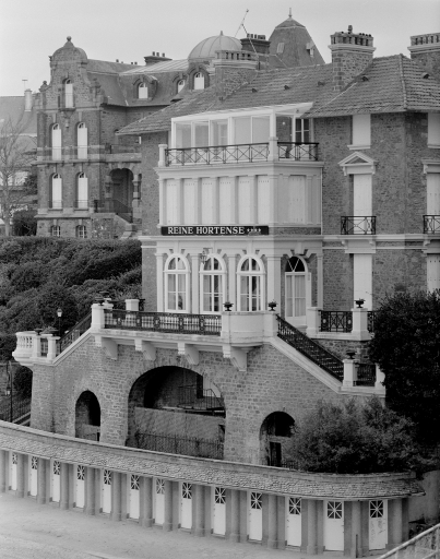 Maison construite par Alphonse Conin en 1900 pour le prince russe de Vlassov qui a en partie meublé cette demeure avec une partie du mobilier de l'un de leurs immeubles parisien ( reprise de lambris, et de panneaux de toile peinte). Consul d'Italie, le prince Nicolas Vlassov a épousé Marie-Joséphine-Catherine de Bauffremont, descendante d'Hortense de Beauharnais qui a laissé son nom à l'hôtel actuel. Une baignoire d'Hortense de Beauharnais a été réemployé à l'étage. Décor somptueux du grand salon avec panneaux de toile peinte évoquant une atmosphère de jardin. Poêle russe en céramique en provenance des ateliers de Saint-Pétersbourg. Terrasse avec remploi probable de ferronnerie d'époque néoclassique.