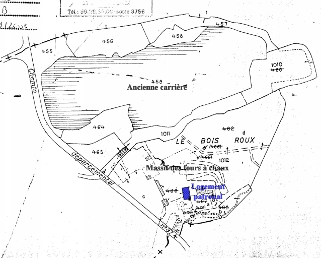 Cette usine à chaux est autorisée en mars 1857 par arrêté préfectoral. Composée de deux fours, l'usine est créée par S. Guichard. Ultérieurement, quatre fours viendront s'ajouter aux deux premiers. Le 20 novembre 1924, constitution d'une société en nom collectif entre MM. Chevrel, Lefilleul et Bestin pour la fabrication et la vente, en gros et en détail, de la chaux hydraulique et de la chaux grasse. En raison de la guerre, l'établissement cesse son activité en 1939. Actuellement les fours sont englobés dans une propriété privée. En 1907, mention de deux machines à vapeur utilisées respectivement pour l'exploitation de la carrière de pierre à chaux et pour les fours du Bois Roux. L'une présente une forme horizontale semi-tubulaire à deux corps, une surface de chauffe de 37,72 m2, un timbre de 5,5 kg et une capacité de 3,86 m3. La deuxième machine présente une forme horizontale à deux bouilleurs, une surface de chauffe de 27,98 m2, un timbre de 5,5 kg et une capacité de 7,844 m3.