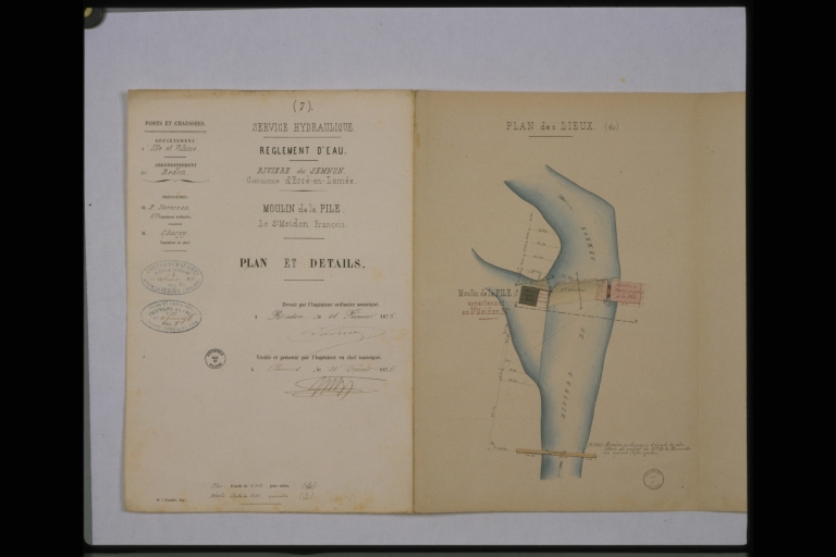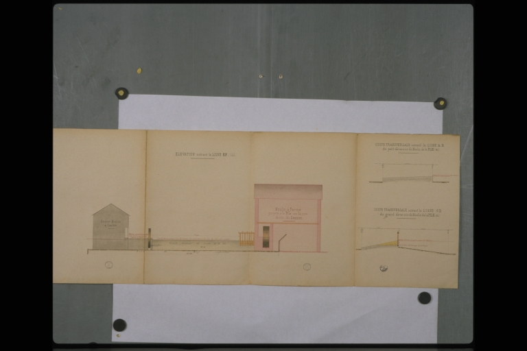 Moulin de la Pile, plan des lieux, élévation des deux moulins et coupe transversale des déversoirs, AD Ille-et-Vilaine 7S 17. Fonds préfecture. Service hydraulique, réglementation (18 février 1876).