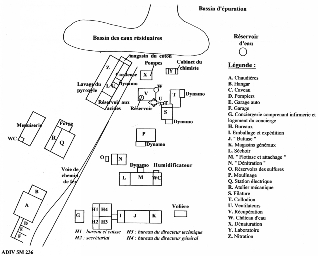 Site desservi par embranchement ferroviaire de part et d'autre duquel s'organisent les différents ateliers de la soierie. Les bâtiments des anciens séchoirs, comprenant également le magasin du coton, le réservoir aux acides et l'atelier de lavage du pyroxyle, sont construits en schiste et sont couverts d'ardoises et de ciment amiante. Le château d'eau, très remanié et en partie détruit, est en schiste, en briques creuses et en ciment dans sa partie haute. Il est accolé au bâtiment renfermant le collodion, de plan rectangulaire, en schiste, flanqué de contreforts. Le laboratoire, à un étage carré et un étage de comble, est construit en schiste et couvert d'un toit à croupes en ardoises. Au centre du site, subsiste en partie un atelier enduit et couvert de deux sheds en ardoises. Le logement du concierge, à un rez-de-chaussée et un étage de comble, est construit en schiste et couvert d'un toit à longs pans en matériau synthétique. Dans son prolongement, sont implantés les différents bureaux, bâtis dans les mêmes matériaux, puis les magasins d'emballage et d'expédition en rez-de-chaussée, couverts d'un toit à longs pans. Les chaudières, le garage pour automobiles, ainsi que l'entrepôt industriel, sont situés dans un vaste bâtiment en grès, à un étage carré. La façade postérieure est enduite. Ce bâtiment se compose de trois corps accolés à pignon en façade et surmontés chacun d'un toit à longs pans en matériau synthétique.