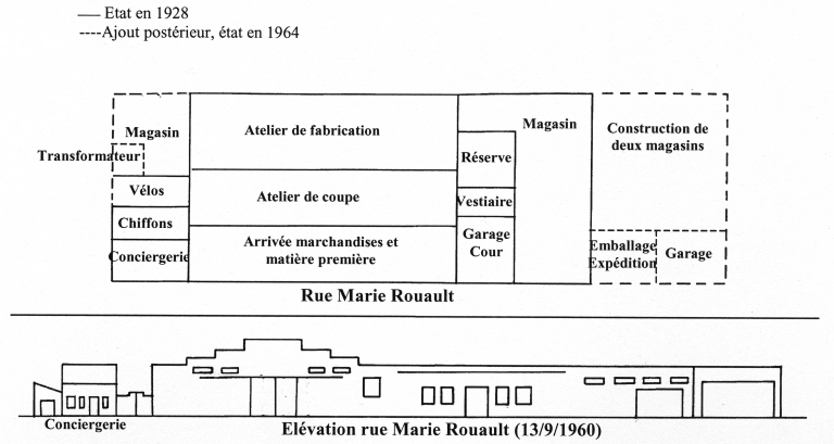 L'usine, de plan rectangulaire, en rez-de-chaussée, est construite en béton armé enduit. La façade antérieure, surélevée sur ses trois quarts par un redent formant couronnement, est régulièrement percée de baies barlongues. Ce décrochement, situé sur la ligne de faîte de l'élévation, constitue la base du grand fronton à redents réalisé dans les années 1960. L'usine de confection, divisée transversalement en deux, comprend, d'une part l'atelier de fabrication, l'atelier de coupe, les bureaux et la zone d'arrivage des matières premières, couverts d'un toit en terrasse en matériau synthétique, et d'autre part, les magasins et vestiaires, couverts de sheds en tuiles mécaniques. L'ensemble des ateliers et des bureaux occupent une surface couverte de 2500 m2. Un pan de mur de l'usine, situé rue Rabelais, est en moellons de grès.