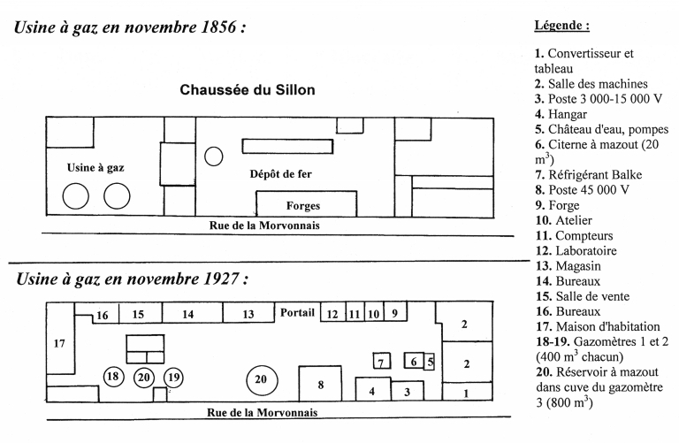 Le 29 juillet 1856, un traité est passé entre la ville de Saint-Servan et la société Eugène Lebon et Cie, représentée par M. Lebon, ingénieur des Arts et Manufactures, pour l'éclairage au gaz de la ville. En 1857, MM. Lebon père et fils et Cie sont autorisés à construire une usine d'éclairage par le gaz hydrogène sur un terrain communal que leur a cédé la ville de Saint-Malo, sur la chaussée du Sillon. Le gaz est alors fabriqué par l'hydrocarbure de houille et la fusion continue. L'épuration du gaz se fait par l'oxyde de calcium et les sels métalliques pour condenser les sulfhydrates de potasse. L'usine à gaz se compose alors de fours à cinq cornues et de deux gazomètres. Un large conduit souterrain amène les produits gazeux ou fumées de combustion de tous les foyers dans une cheminée haute de 30 m. A partir de septembre 1878, date à laquelle l'éclairage des villes de Saint-Malo et de Saint-Servan est achevé, l'usine à gaz est en pleine activité et fonctionne dans les meilleures conditions. En avril 1913, la société Lebon et Cie, concessionnaire de l'éclairage de la ville de Saint-Servan, mais aussi de Saint-Malo, est autorisée à établir, avenue Aristide Briand, une seconde usine pour la fabrication du gaz d'éclairage. En 1923, installation d'un réservoir à mazout. En 1927, trois réservoirs à mazout de 45 m3 chacun sont installés dans la cuve d'un gazomètre de 800 m3. Depuis la loi du 8 avril 1946 qui marque la nationalisation de l'électricité et du gaz, Electricité et Gaz de France ont pris en charge et assurent le fonctionnement du service public de production et de distribution du gaz. Aujourd'hui, l'usine à gaz du Sillon, partiellement détruite, abrite des bureaux d'EDF-GDF et le site de la seconde usine à gaz, avenue Aristide Briand, a été entièrement reconstruit. En 1878, l'usine à gaz emploie huit ouvriers.
