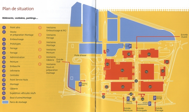 Le site présente une superficie totale de 240 ha desservie par 20 km de routes et de pistes intérieures, ainsi que par un important embranchement ferroviaire composé de dix-huit voies ferrées. Un axe principal nord-sud, ainsi que divers axes est-ouest desservent les différents secteurs de production. Au nord se situent les ateliers d'emboutissage et de ferrage, au sud sont implantés ceux de la câblerie, de la peinture et du montage. Chaque bâtiment est équipé de quais de chargement ou de déchargement. A l'entrée principale du site se trouvent les bâtiment administratifs, sociaux et culturels édifiés en béton armé et en granite, à un sous-sol et deux étages carrés. Les différents ateliers de fabrication, en béton armé et en granite, sont couverts de sheds supportés par une importante charpente métallique. Les ateliers de ferrage et de peinture, d'une surface respective de 90 000 m2 et de 105 000 m2, ont un étage carré. L'atelier d'emboutissage, de 67 500 m2, a un sous-sol. L'atelier de montage présente une surface de 160 000 m2. Le site a une superficie couverte de 80 ha. A l'arrière se situent une piste d'essai, les différents parcs de stockage ainsi que les voies ferrées.