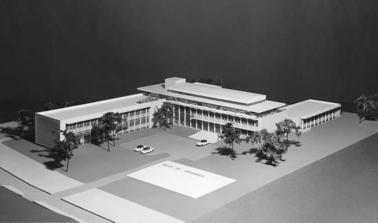 Salle de conférence, élévations, AM Rennes 8Z 146. Usine Citroën de la Janais. Construction des bâtiments administratifs. Plans, photographies de maquette et de chantier (16 septembre 1961).