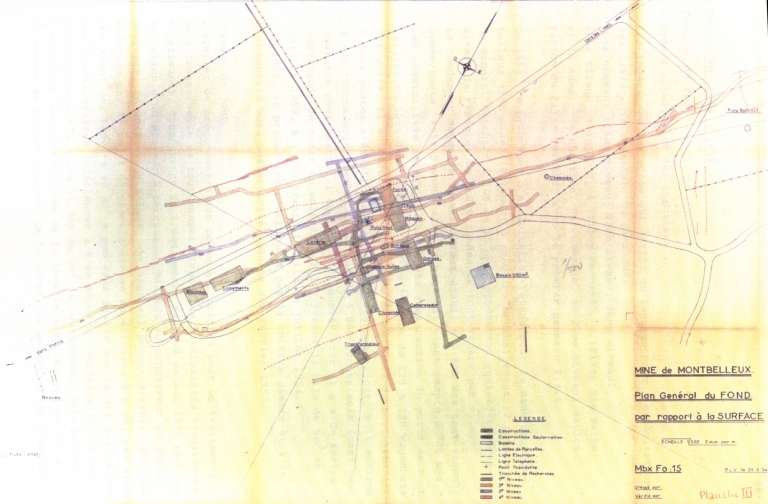 Mine de Montbelleux, plan général du fond par rapport à la surface, BODIN, J.-M. (dir.). La mine de Montbelleux 1903-1983, Luitré (Ille-et-Vilaine) . Rapport dactylographié, sd, 48 p. (29 juin 1954).