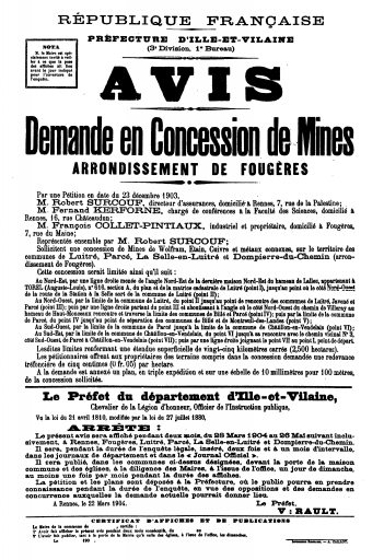 AD Ille-et-Vilaine 8S 29. Fonds préfecture. Mines et carrières, demandes de concessions particulières (1903-1907).