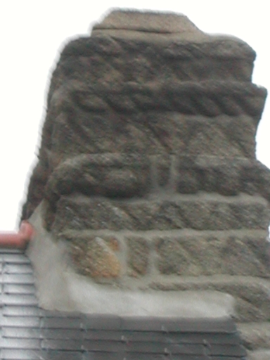 Une souche de cheminée porte un décor à motifs géométriques.