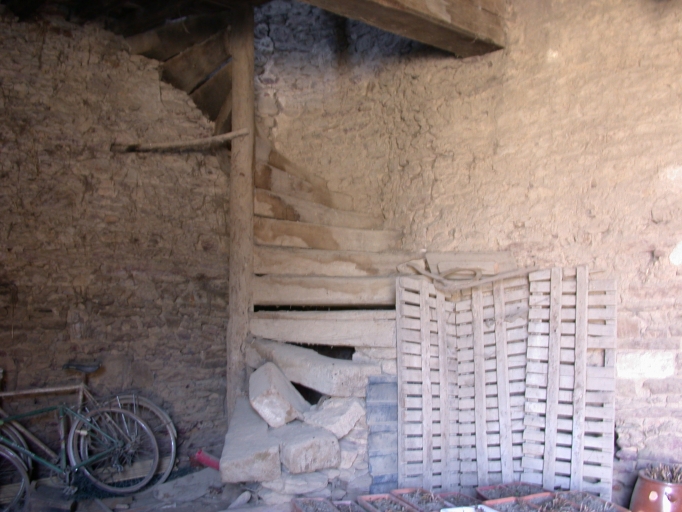 Ancien logis-porte de la 1ère moitié du 15e siècle dont seule est conservée la façade nord, côté cour. Il a été remanié au 16e siècle (ouvertures hautes). Son originalité réside en la présence d'une vaste porte à claveaux de schiste flanquée de deux portes secondaires de même type. Déclassé en remise lors de la construction du nouveau logis de ferme dans la première moitié du 20e siècle. Plan en U avec parties agricoles indépendantes s'organisant autour d'une cour carrée.