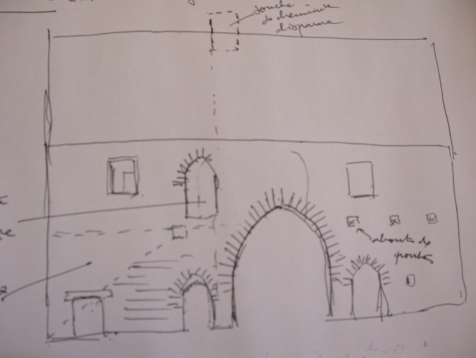 Logis-porte. Présence d'un étage. Encadrements de certanes baies en pierre de taille de granite. Parties agricoles avec grenier en haut surcroît. Logis de la ferme en rez-de-chaussée surmonté d'un surcroit. Lucarne pendante.