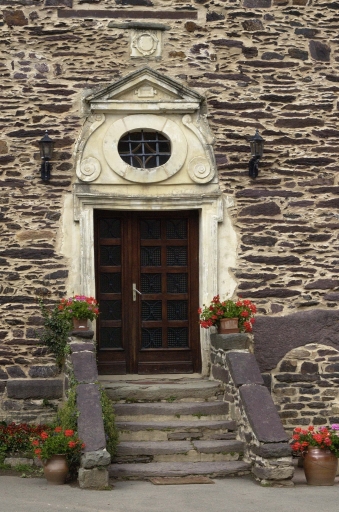 Gros oeuvre en moellons de schiste avec un appareillage différent à mi-partie. La porte principale est en pierre de taille de calcaire. Son chambranle à crossettes est surmonté d'un occulus sommé d'un fronton triangulaire. La date de 1576 est portée sur un cartouche au centre du fronton. Tour carrée hors oeuvre située à l'arrière du logis. Sablières moulurées sous le toit.