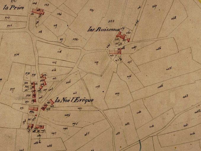 Feuille cadastrale de la section I2 dite du Cannée, par Lebreton géomètre, [1823], échelle 1/2500e (A. D. d'Ille-et-Vilaine : 3 P 5438).