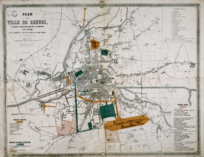 [1861]. Plan de la ville de Rennes, avec indication des travaux exécutés depuis 1855, sous l'administration de M. A. de Léon, en voie d'exécution au 1er mai 1861 ou votés par le conseil municipal, lithographie, Oberthür éditeur (A. C. Rennes ; 1 Fi 76).