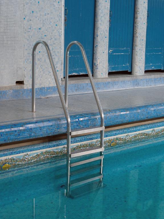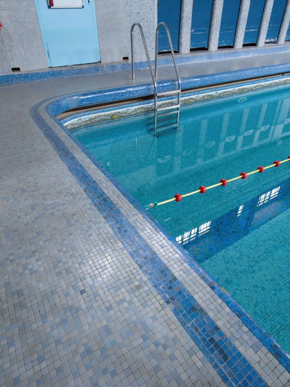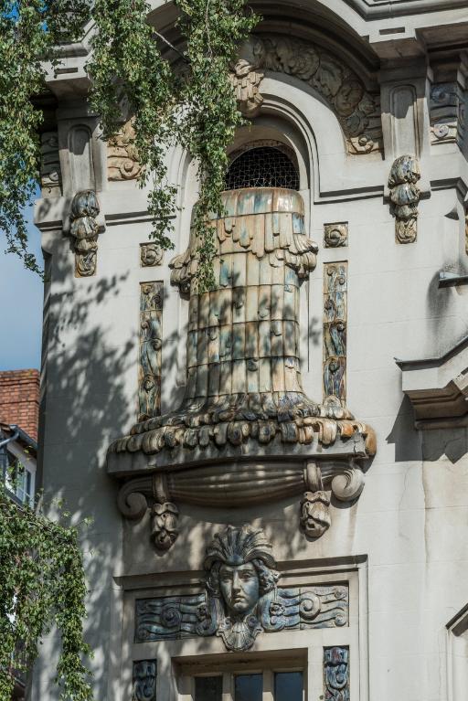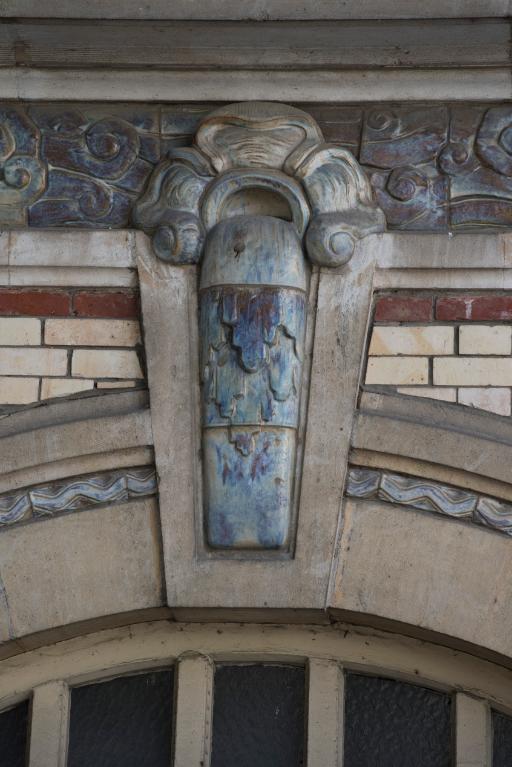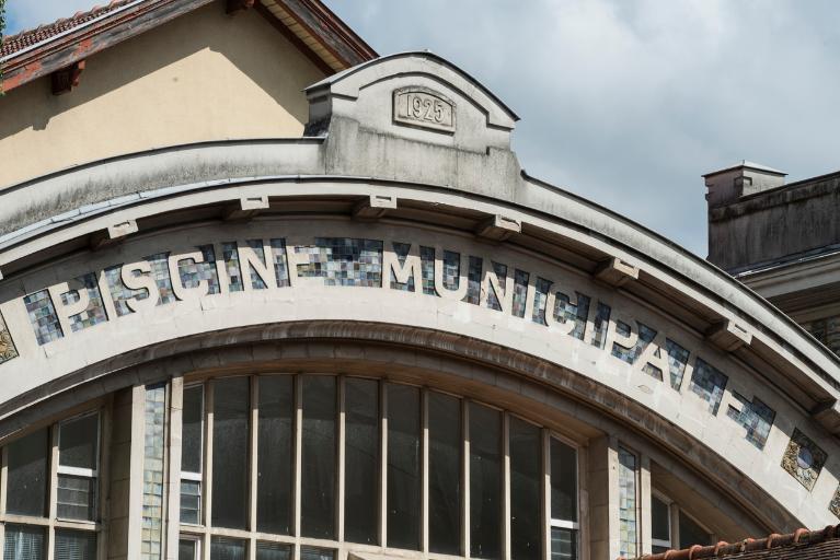 Le décor de grès flammé fut réalisée par les céramistes Gentil et Bourdet ; Le Ray choisit cette entreprise spécialisée avec laquelle il put élaborer et fournir les modèles de sculptures. Le marché passé en 1925 comprend tous les motifs, frises plates et cintrées, cabochons, clefs d´arc, chutes, mascarons, consoles, plinthes, le carrelage et les inscriptions « Piscine Municipale » et « Bains-Douches » qui ornent les différentes parties du bâtiment.
