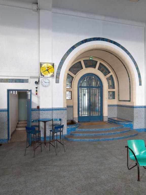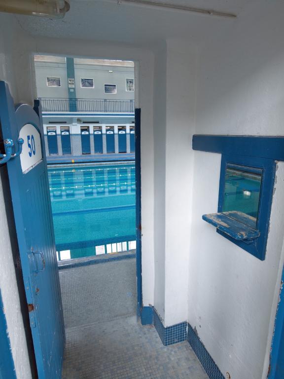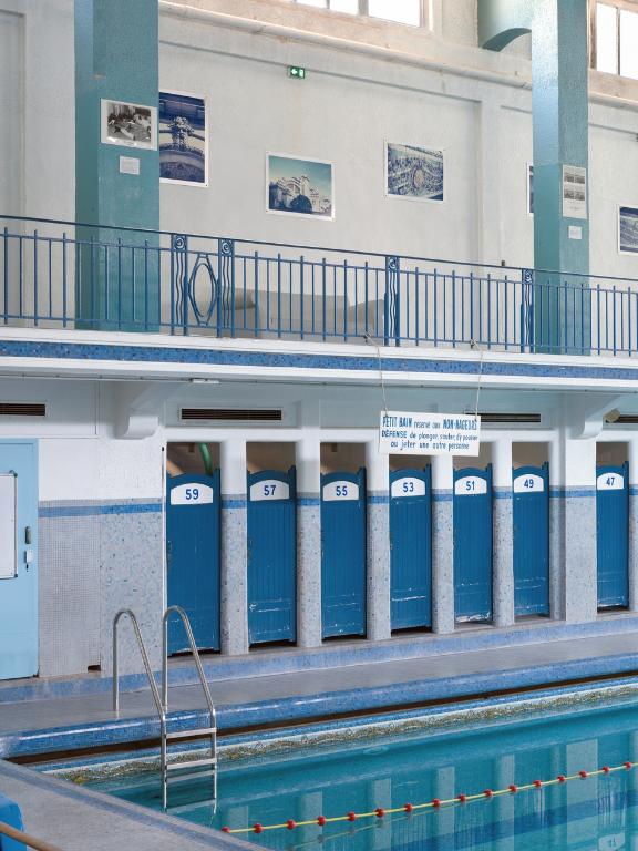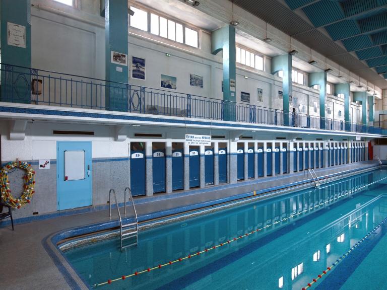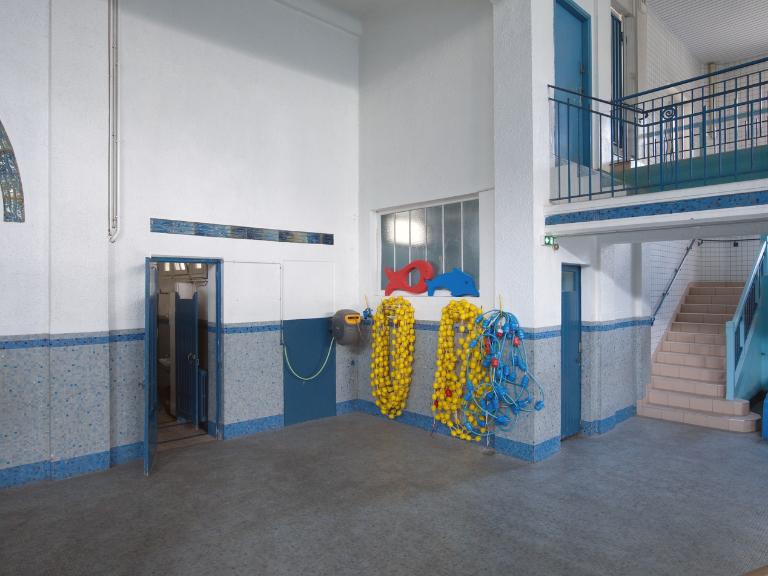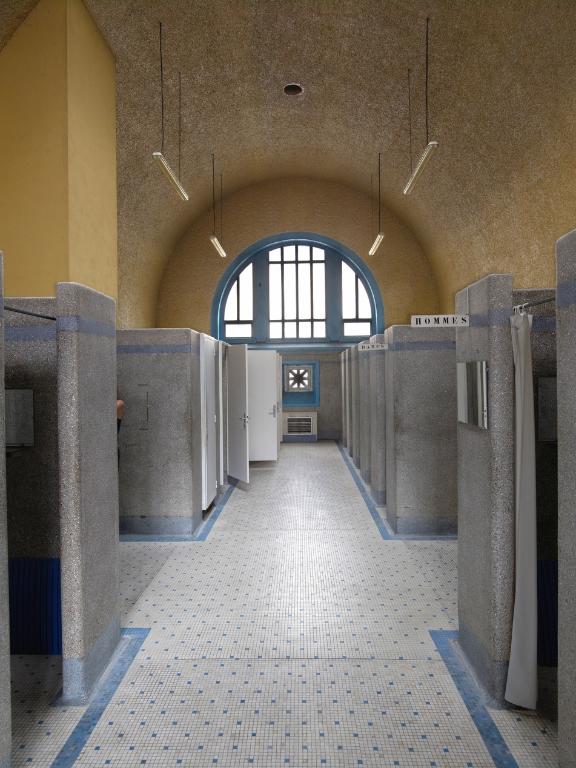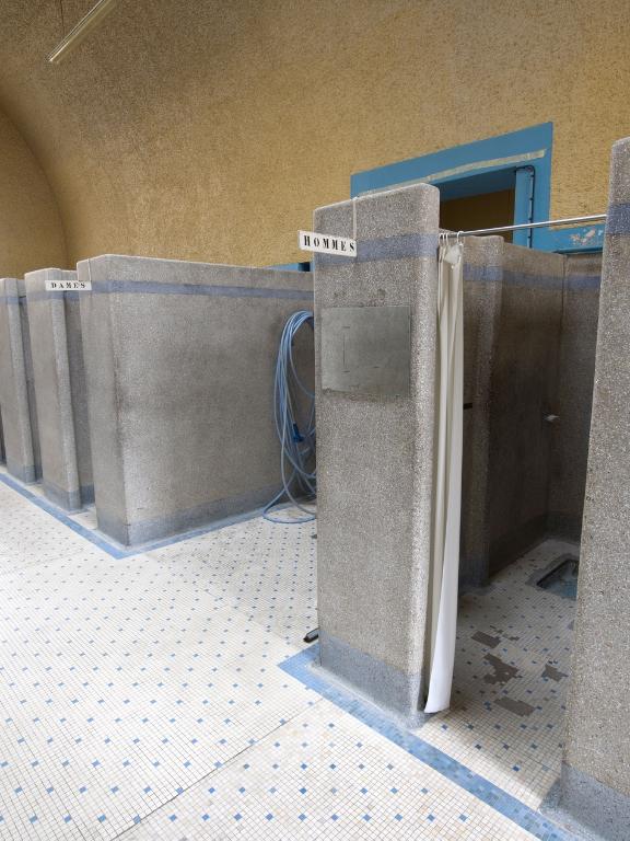 L´établissement de bains, accessible depuis la piscine, se compose donc d´un vestibule disposant d´une entrée indépendante sur la rue Victor Hugo lequel donne accès, sur la gauche, à une longue salle renfermant 24 cabines de douches et baignoires, puis encore à l´Est à des toilettes et pièces de service (lingerie, buanderie, réserves).