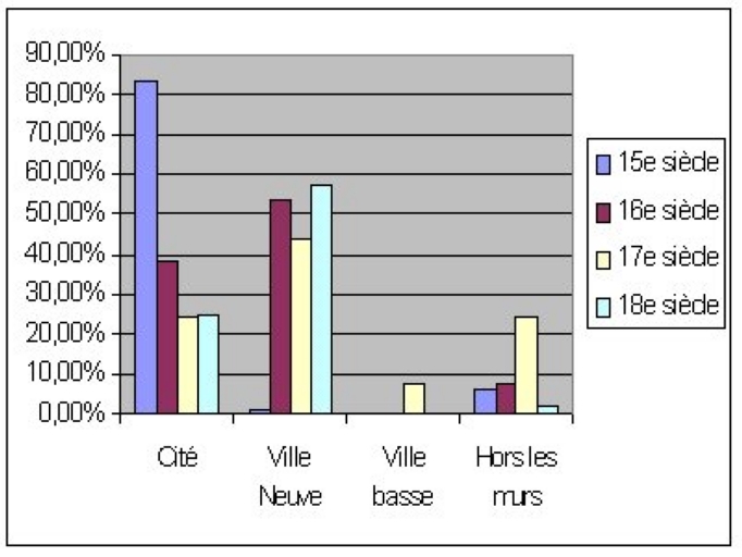 Le dépouillement de l´ouvrage de Banéat confirme une implantation des hôtels dans la Cité, puis à partir du 16e siècle, dans la Ville Neuve, enfin hors les murs, à partir du milieu du 17e siècle, au nord-ouest et au nord-est de la ville. Deux lotissements sont réalisés hors les murs au 17e siècle, aux Lices avec des parcelles traversantes, et contour de la Motte où les parcelles sont irrégulières mais cependant plus vastes. Les hôtels reconstruits après 1720, dans le secteur redessiné par Robelin, s´inscrivent alors dans un site de lotissement marqué par des contraintes édilitaires, notamment les portes cochères proscrites des places.