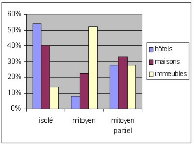 L´implantation en isolé, la plus fréquente (62%), est très supérieure à celle de l´ensemble des hôtels. L´implantation en mitoyenneté totale (8.5%) ou partielle (27.5%) est proche de celle de l´ensemble des hôtels.