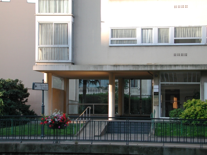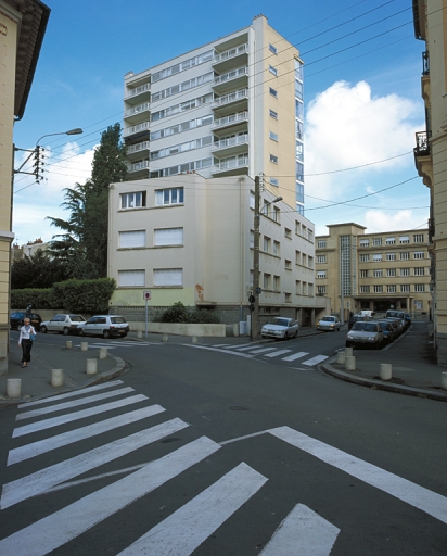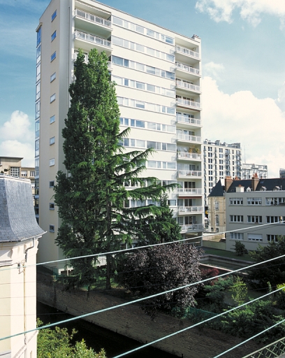 - PINTE Cet ensemble de deux immeubles avec jardin est l'une des réalisations les plus remarquables de l'architecte Maillols dans l'immédiate après-guerre. Implanté en parcelle traversante, baignée par un bras de la Vilaine, il est composé de deux volumes dont le gabarit s'inscrit dans les contraintes édilitaires. Il faut apprécier ici, outre l'innovation constructive - c'est la première tour construite à rennes - la présence des oriels d'angle, au nord, version modernisée de la fenêtre d'angle fréquente autour de 1940, et celle d'une baie vitrée en rez-de-chaussée jouant le rôle de fenêtre urbaine qui ménage une perspective sur le jardin paysager au sud et permet à l'architecte de disposer du recul nécessaire par rapport à la rue Dupont des Loges. Cette réalisation atteste également, par la qualité de son programme, du rôle initiatique que va jouer Maillols dans la diffusion d'une architecture moderne qui s'inscrit dans l'image de la ville, en démontrant la réconciliation possible entre logement et monumentalité.