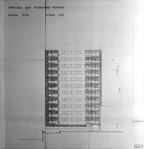 Immeuble, quai de Richemont. Elévation de la façade sud, plan d'exécution (A. C. Rennes).