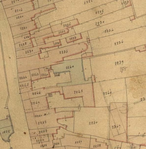 Archives départementales d'Ille-et-Vilaine[1842]. Plan cadastral parcellaire de la commune de Rennes. Section A, dite de l'hôtel de ville, 6e feuille, dessin, Jouchel du Ranquin, Roger, Viel, Ferré et Simon géomètres, 1842 (A. D. Ille-et-Vilaine).