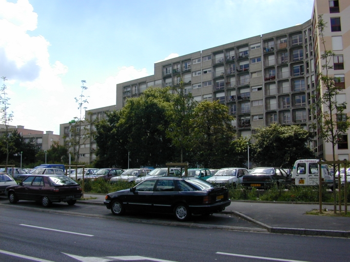 Ilot délimité par 4 voies larges, 2 primaires nord-sud et 2 secondaires est-ouest. Dessertes internes serpentines. Equipements en position périphérique, au sud.
