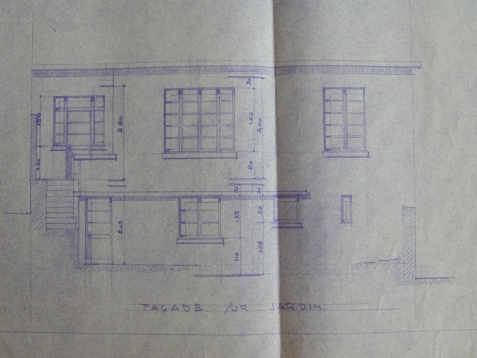 Propriété de M. Laforge, façade sur le jardin, dessin d'exécution, par E. Laforge, 1949 (A.C. Rennes).