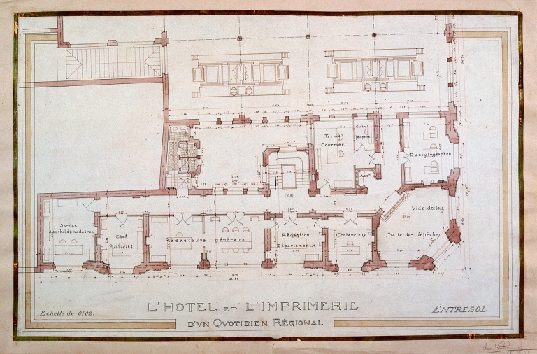 L'hôtel et l'imprimerie d'un quotidien régional à Rennes. Plan de l'étage, plan aquarellé, René Guillaume (A. P.).