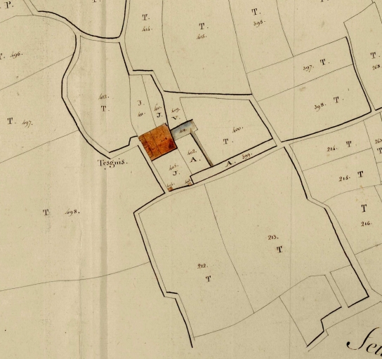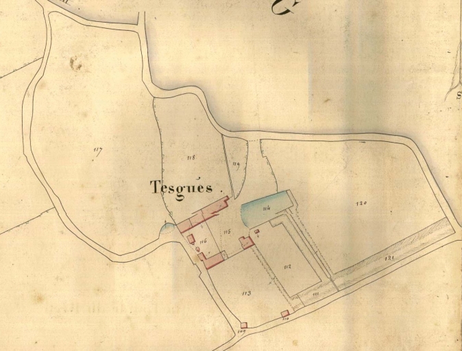 Le cadastre de 1812 indique la présence de deux jardins, au nord et au sud, et de deux avenues et d'un vivier, prolongé par un canal. Sur le cadastre de 1842, les avenues et le vivier sont toujours visibles. Un four et un fournil sont construits dans la cour, entre deux corps de bâtiments parallèles. Selon Paul Banéat, l'ancien manoir de Tesgués, attesté en 1513, possède un jardin clos de levées et de douves, une chapelle et un presbytère.