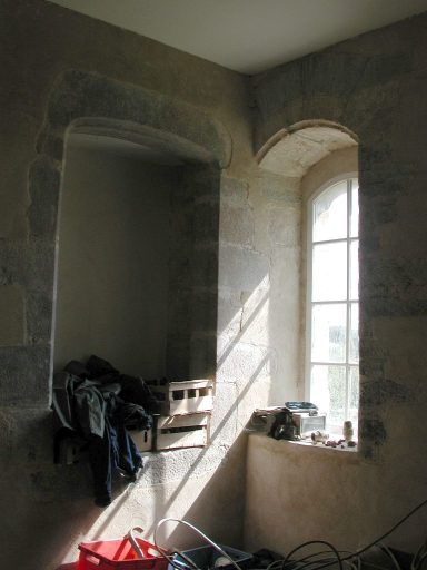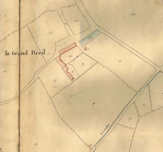 Bien que partiels et en grande partie vidés de leur contenu, les vestiges du Grand Breil sont encore suffisamment parlants pour donner une idée du luxueux logis construit dans les premières années du 16e siècle par le riche Thomas Feillée, contrôleur général des deniers de la ville. Il s´agit d´un vaste logis à salle basse unique, montant de fond jusqu´au comble, directement issu du type sous charpente. Il est probable que dans le cas du Grand Breil, cette grande salle, largement éclairée au nord et au sud par deux baies à croisée de bois, était plafonnée dès l´origine et non selon l´ancien usage des 14e et 15e siècles surmontée d´une charpente apparente. La disparition de la cheminée de cette salle, dont la richesse est signalée par P Banéat, lors du démontage des murs de refends au début du 20e siècle ne permet pas de trancher absolument cette question. Au delà du mur de refends disparu qui fermait la salle à l´ouest et portait la cheminée se trouvaient deux chambres sur caves : les murs gouttereaux sud et nord gardent la trace de leurs anciennes portes de communication. Ainsi le « somptueux édifice » construit par Thomas Feillée (1), ne comportait pas moins de trois chambres, une cuisine, une vaste salle et deux caves, luxe relatif si on le rapporte aux imposant ensembles contemporains de la Haute-Martinière, de la Motte au Chancelier et de la Prévalaye, mais sans doute réel en considération de l´extraction roturière de ce personnage, bourgeois enrichi dans la gestion des comptes de la ville et non encore anobli. La formule choisie au Grand Breil, celle du logis à salle basse unique, est également celle retenue à la même époque au logis de Villeneuve, dont un dessin de 1830 nous donne une image fidèle.