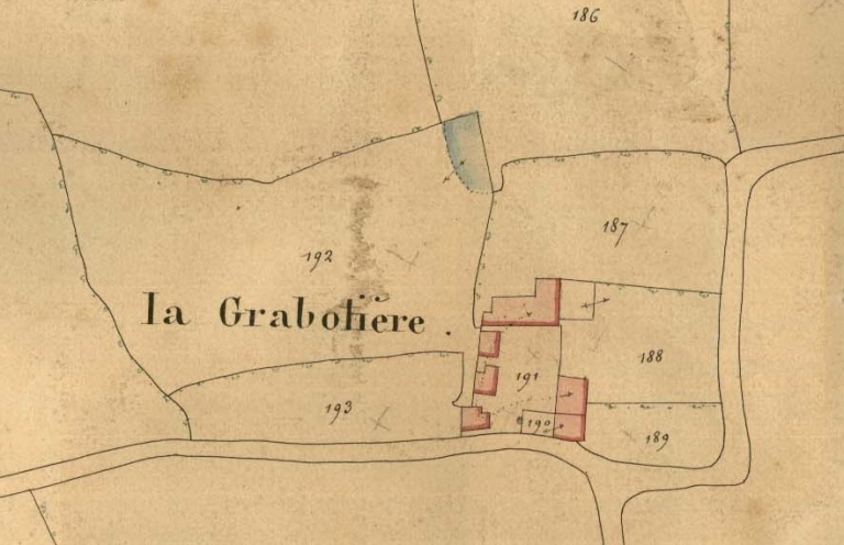 Selon Paul Banéat, l'ancienne maison noble de la Grabotière est attestée en 1664, date à laquelle elle appartient aux Louaisel. Propriété des Pichot, entre 1695 et 1733, elle est vendue aux Prodhomme, sieurs de la Lande, en 1745. Au 19e siècle, elle appartiendra à des proches de la famille Brossays-Saint-Marc. Selon l'auteur, un acte notarié de 1733 indique qu'elle posédait une tonelle et des allées de charmiers. Une statue de la Vierge, en terre cuite, protégeait la ferme de la foudre, au 18e siècle ; elle fut placée dans un oratoire après la Révolution, qui était un lieu de pélerinage. Plusieurs corps de bâtiment sont visibles sur le cadastre de 1842. Un corps de logis, au nord de la cour, et plusieurs dépendances isolées construites à l'est et à l'ouest. Un vivier est visible au nord-ouest.