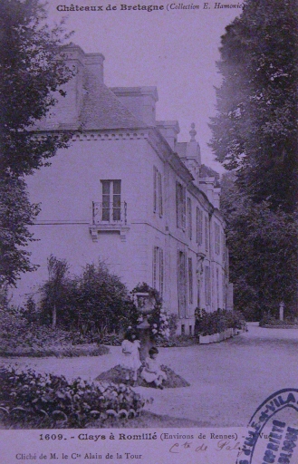 Château de Clayes en Romillé [sic]. Environs de Rennes. A M. le Comte de Palys, Bretagne (Collection E. Hamonic), cliché de monsieur le comte Alain de la Tour [s.d.] (A. D. d'Ille-et-Vilaine : Clayes 6 Fi).