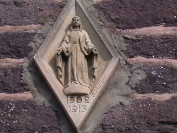 Gros oeuvre en schiste. Les encadrements des baies, le corniche et les lucarnes sont en brique polychrome. Bas relief représentant un saint daté 1902 1913 et signé J Philippe.