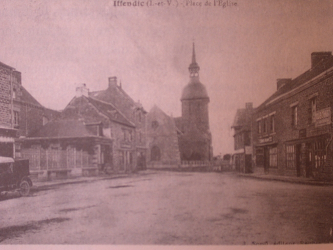 Iffendic, place de l'église, carte postale, J.Sorel, éditeur, in JET, René. Iffendic, son histoire. Les gens d'ici. Copyright : René Jet, Rennes, 1999.