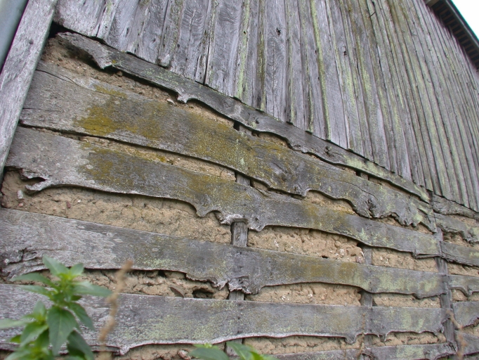 Logis de construction mixte en moellons de schiste et de quartz et terre en partie haute. Remise en pan de bois et terre.